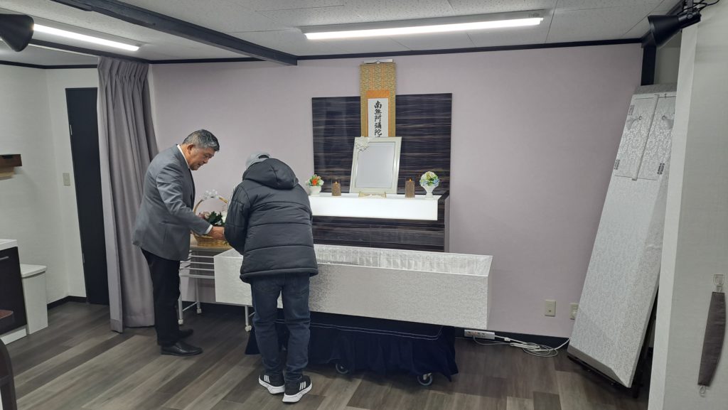 ホームページであさひ葬祭を探されてご依頼をいただきました。母が東淀川区の施設にいらっしゃって近くの葬儀屋さんを探されたということでした。喪主様は長男様で、守口市にて生活保護を受けられているので、飯盛斎場での火葬をさせていただいております。お別れは当社のあさひ家族葬ホールにて1時間ほどお別れをして頂き、霊柩車に同乗して喪主様も飯盛斎場まで行かれました。帰りは当社の寝台車にて守口までお送りすることになっております。